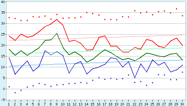 - Explanations to the chart. Current minimum, average, and maximum air temperature in Rjazan' are represented on the chart by solid lines of blue, green, and red colors. Normal values are shown as solid thin lines. The absolute highs and lows of temperature for each day are indicated by bold red and blue dots.