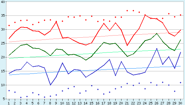 - Explanations to the chart. Current minimum, average, and maximum air temperature in Izmail are represented on the chart by solid lines of blue, green, and red colors. Normal values are shown as solid thin lines. The absolute highs and lows of temperature for each day are indicated by bold red and blue dots.