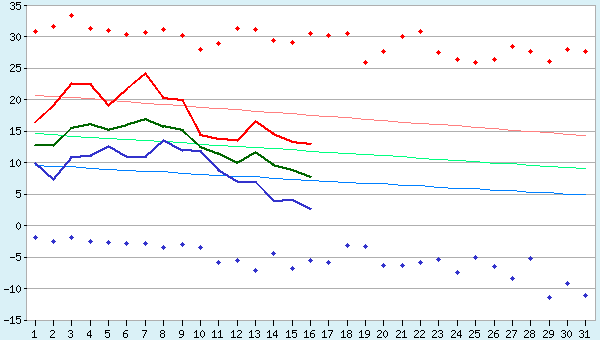 The lowest minimum temperature (4.0°C) recorded on October 14. The highest maximum temperature (24.2°C) recorded on October 7.