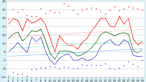 - Explanations to the chart. Current minimum, average, and maximum air temperature in Ahty are represented on the chart by solid lines of blue, green, and red colors. Normal values are shown as solid thin lines. The absolute highs and lows of temperature for each day are indicated by bold red and blue dots.