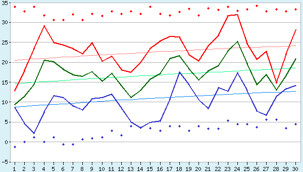- Explanations to the chart. Current minimum, average, and maximum air temperature in Quebec are represented on the chart by solid lines of blue, green, and red colors. Normal values are shown as solid thin lines. The absolute highs and lows of temperature for each day are indicated by bold red and blue dots.