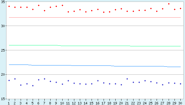 - Explanations to the chart. Current minimum, average, and maximum air temperature in Tracuateua are represented on the chart by solid lines of blue, green, and red colors. Normal values are shown as solid thin lines. The absolute highs and lows of temperature for each day are indicated by bold red and blue dots.