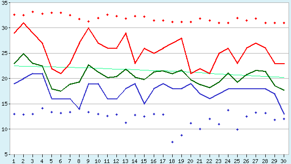 - Explanations to the chart. Current minimum, average, and maximum air temperature in Guarulhos are represented on the chart by solid lines of blue, green, and red colors. Normal values are shown as solid thin lines. The absolute highs and lows of temperature for each day are indicated by bold red and blue dots.