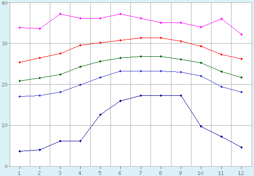 | agosto | 17.2 (1950) | 23.2 | 26.8 | 31.4 | 35.1 (2009) |
