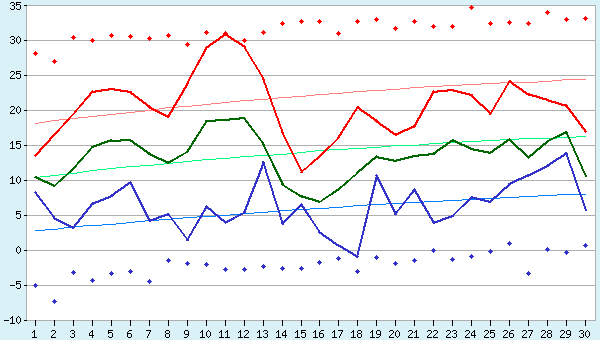 - Explicaciones del gráfico. La temperatura del aire mínima, promedio y máxima actual en Tompo se representan en el gráfico mediante líneas continuas de colores azul, verde y rojo. Los valores normales se muestran como líneas finas continuas. Los máximos y mínimos absolutos de temperatura para cada día se indican mediante puntos rojos y azules en negrita.