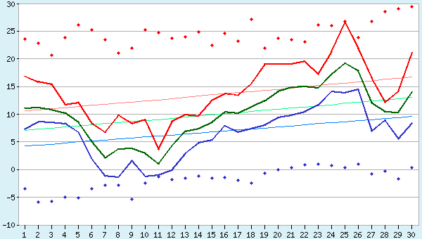 - Explicaciones del gráfico. La temperatura del aire mínima, promedio y máxima actual en Odesa se representan en el gráfico mediante líneas continuas de colores azul, verde y rojo. Los valores normales se muestran como líneas finas continuas. Los máximos y mínimos absolutos de temperatura para cada día se indican mediante puntos rojos y azules en negrita.