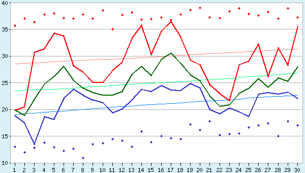 - Explicaciones del gráfico. La temperatura del aire mínima, promedio y máxima actual en Huoshan se representan en el gráfico mediante líneas continuas de colores azul, verde y rojo. Los valores normales se muestran como líneas finas continuas. Los máximos y mínimos absolutos de temperatura para cada día se indican mediante puntos rojos y azules en negrita.