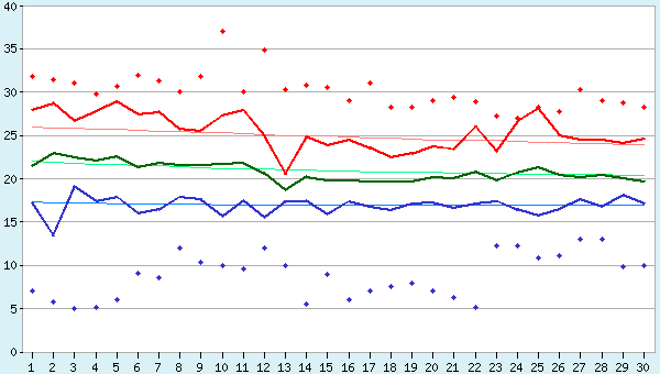 La temperatura mínima más baja (14.1°C) registrada en Diciembre 2. La temperatura máxima más alta (30.4°C°) registrada en Diciembre 11.