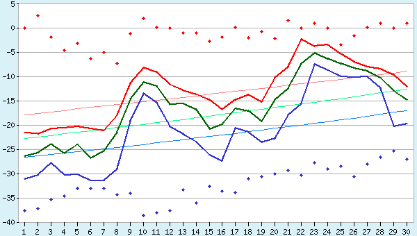 La temperatura mínima más baja (-27.6°C) registrada en Diciembre 1. La temperatura máxima más alta (-3.6°C°) registrada en Diciembre 4.