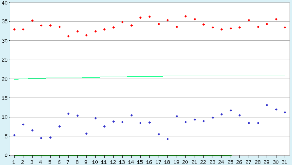 - Explicaciones del gráfico. La temperatura del aire mínima, promedio y máxima actual en Caparao se representan en el gráfico mediante líneas continuas de colores azul, verde y rojo. Los valores normales se muestran como líneas finas continuas. Los máximos y mínimos absolutos de temperatura para cada día se indican mediante puntos rojos y azules en negrita.