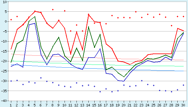 La temperatura mínima más baja (-10.7°C) registrada en Diciembre 1. La temperatura máxima más alta (1.7°C°) registrada en Diciembre 11.