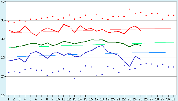 La temperatura mínima más baja (22.7°C) registrada en Octubre 23. La temperatura máxima más alta (33.9°C°) registrada en Octubre 11.